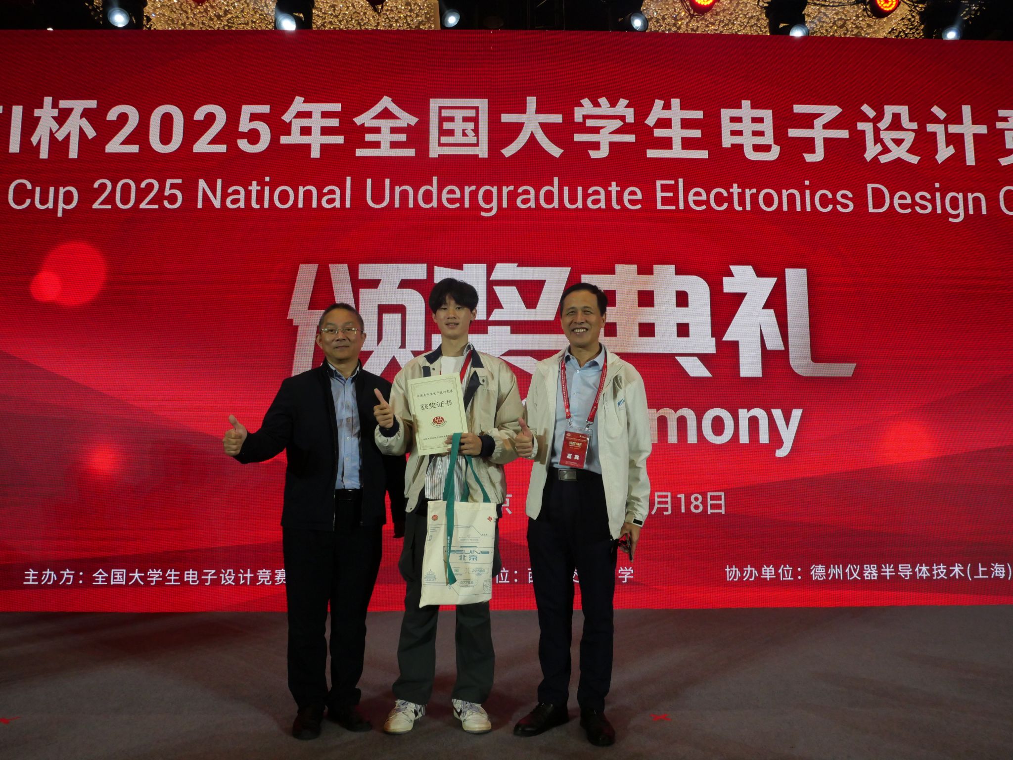 本站讯 (通讯员 曾旭杰)10月18日上午,2025年全国大学生电子设计竞赛(TI杯)颁奖典礼在北京举行。红足—世足球官网首次出征赛事斩获佳绩,一支队获全国大学生电子设计竞赛(本科组)全国二等奖,并代表海南省受邀参加颁奖典礼。