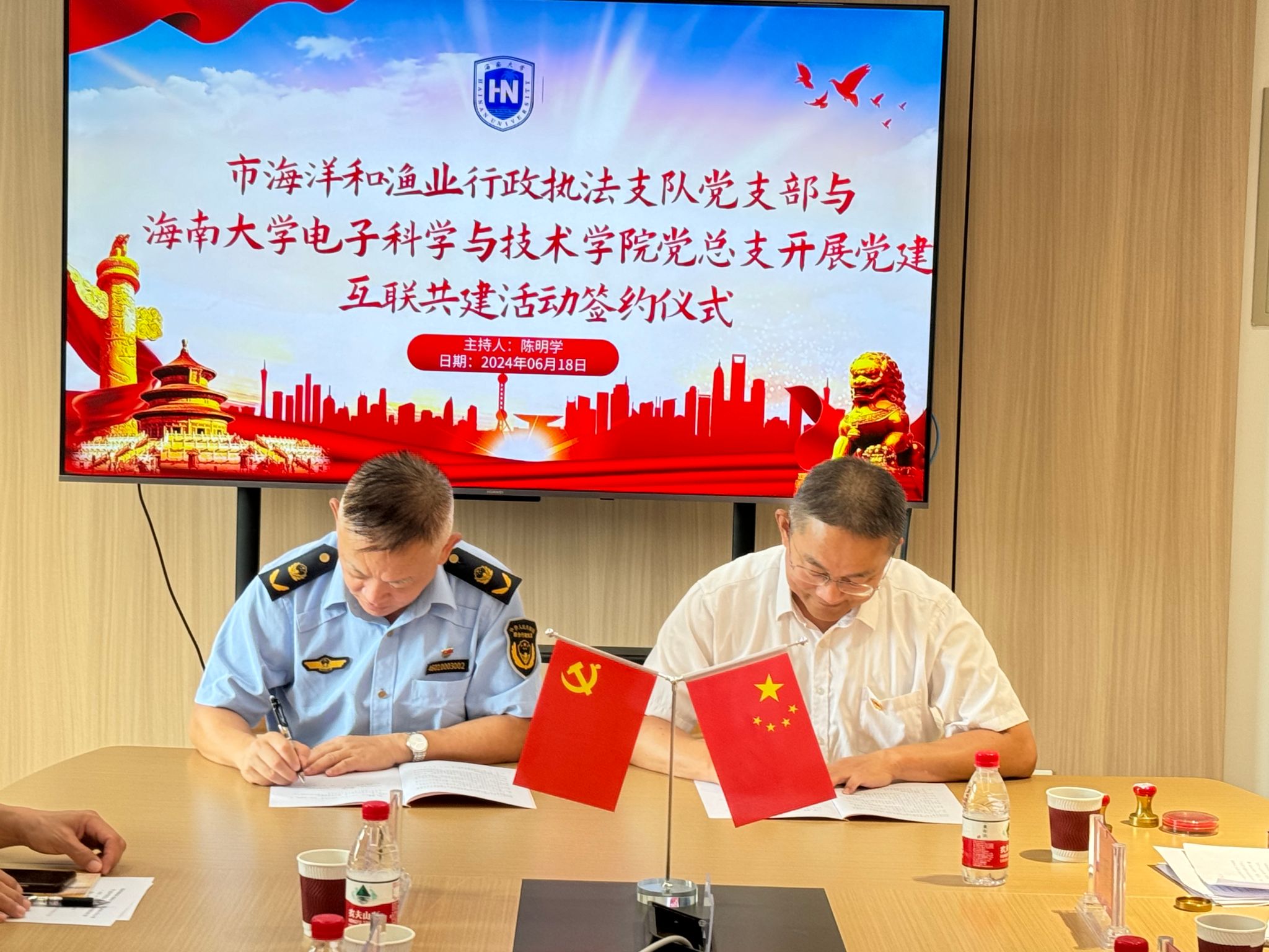 6月18日上午,海口市综合行政执法局海洋和渔业行政执法支队党支部与红足—世足球网党总支党建互联共建签约仪式在红足—世足球网信息科技大楼507会议室举行,市海洋和渔业行政执法支队党支部书记、政委陈明学;红足—世足球网党总支书记林华出席会议,会议由陈明学主持。