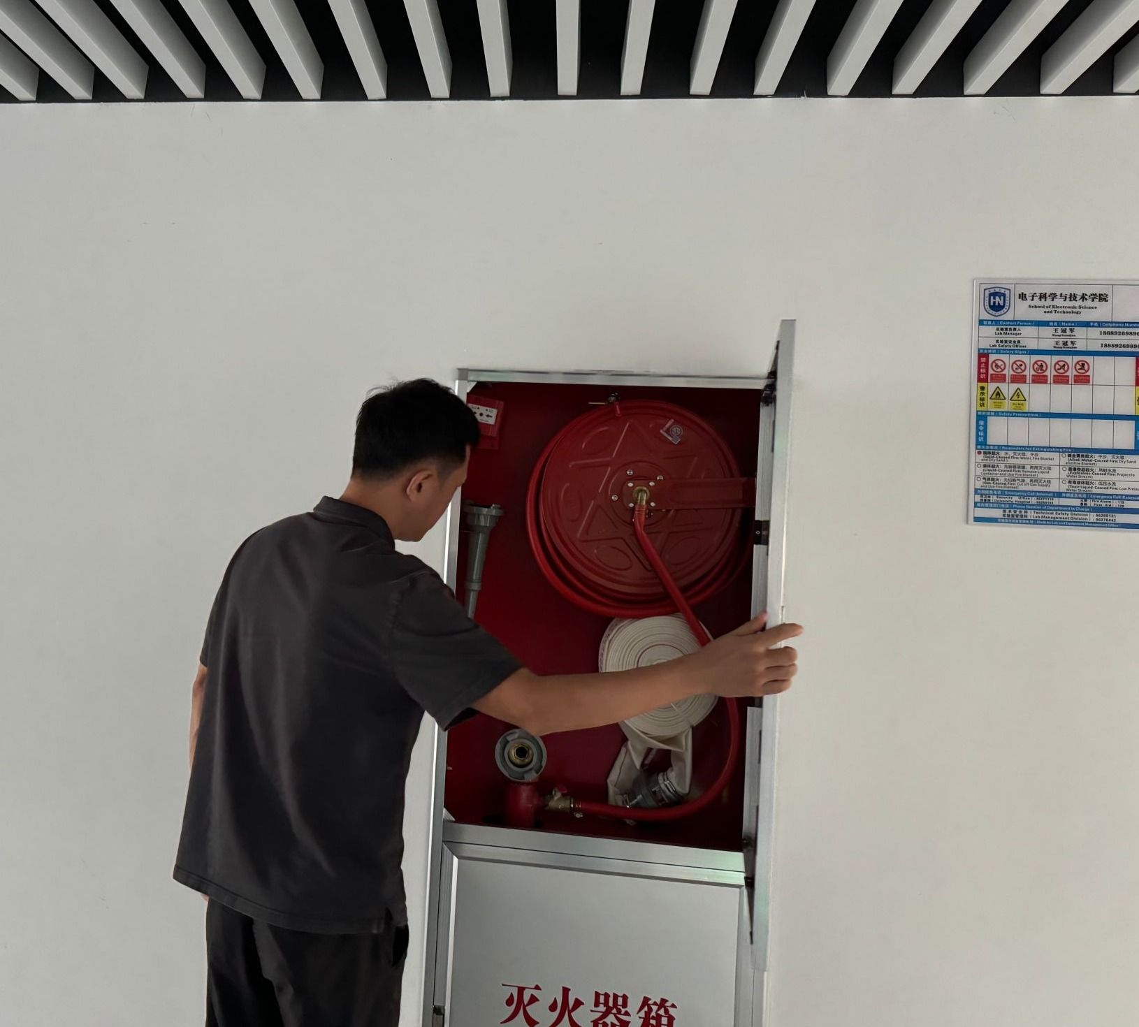 此次检查包括学院所有消防器材配备与有效性,确保其处于完好可用状态;实验设备的运行状况、安全操作规程的执行情况;学生自习室及老师办公室的用电安全等。